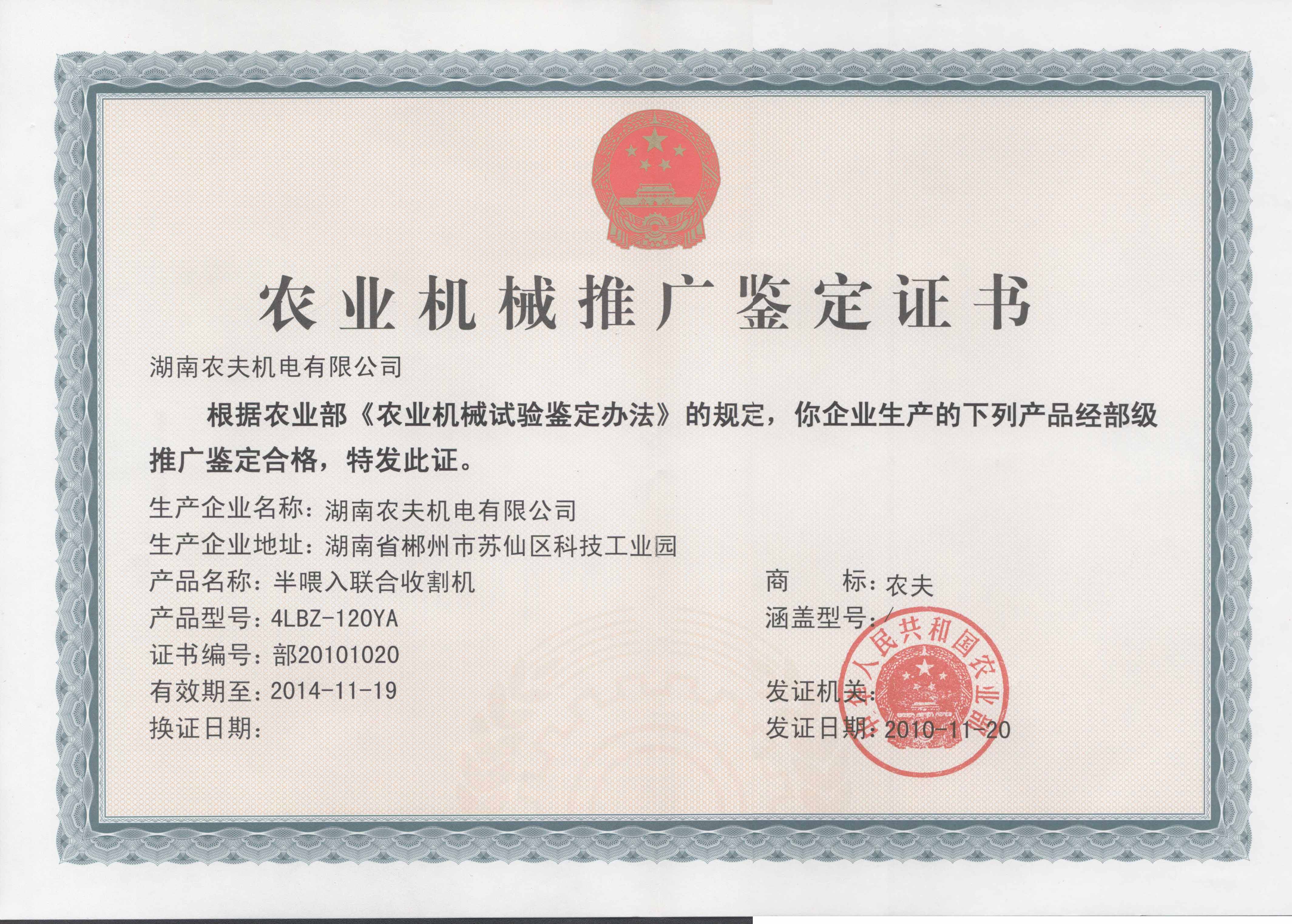 120YA推广鉴定证书